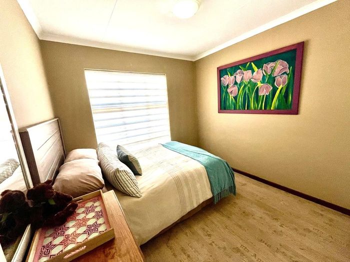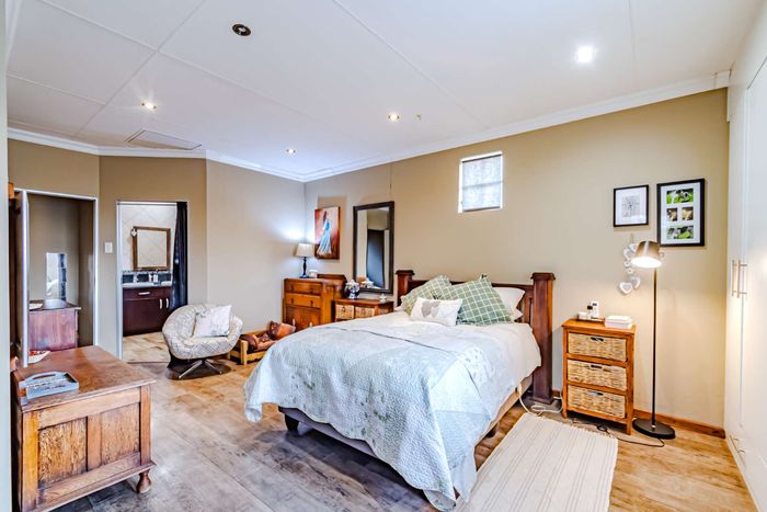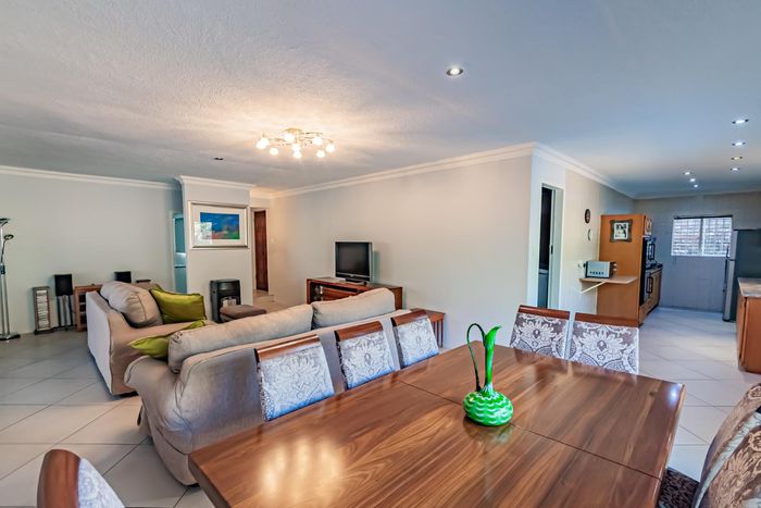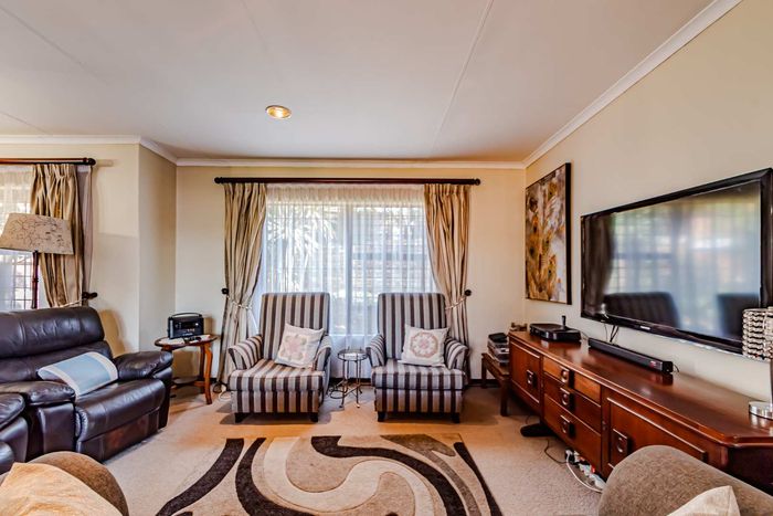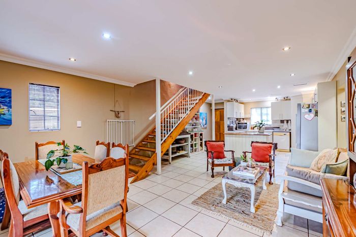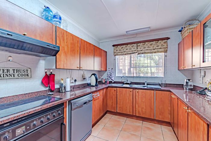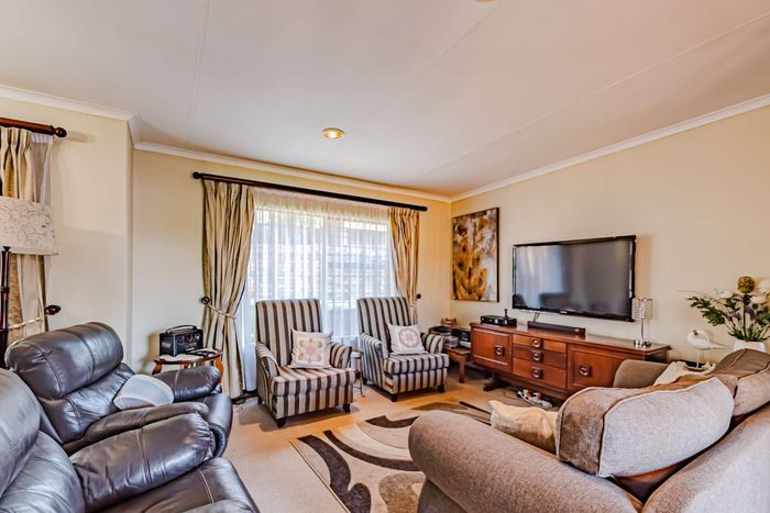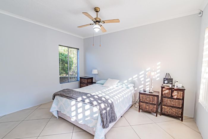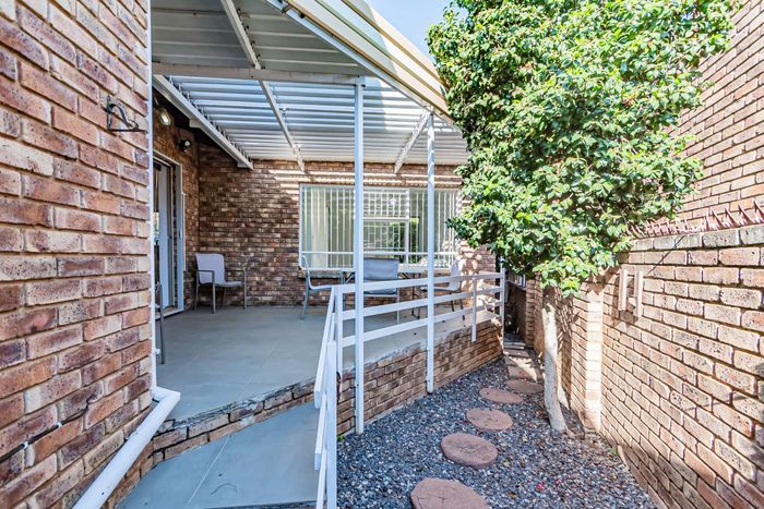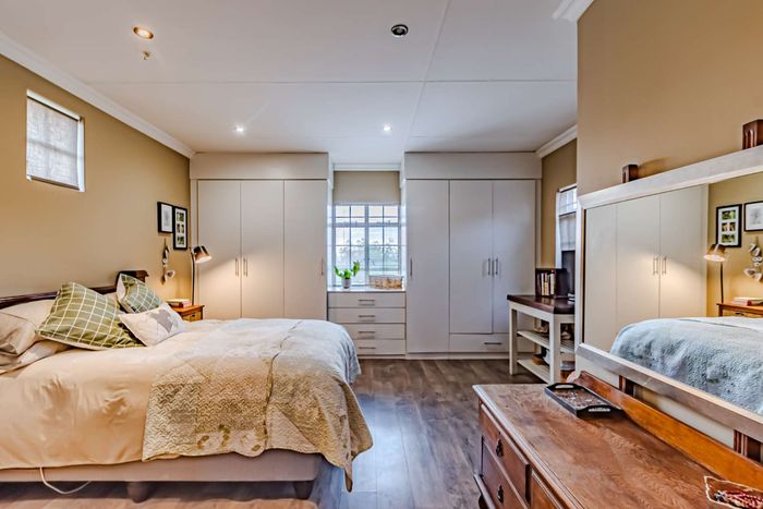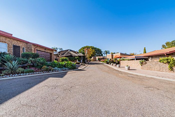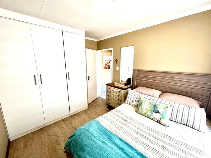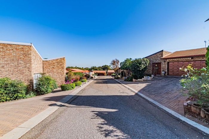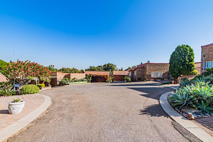 Single-storey cluster home in secure Faerie Glen complex with 2 bedrooms, 2 baths, open-plan living, double garage, and garden.