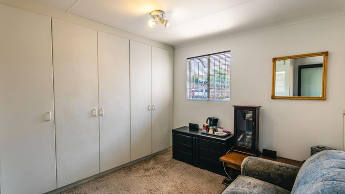Single-storey cluster home in secure Faerie Glen complex with 2 bedrooms, 2 baths, open-plan living, double garage, and garden.
