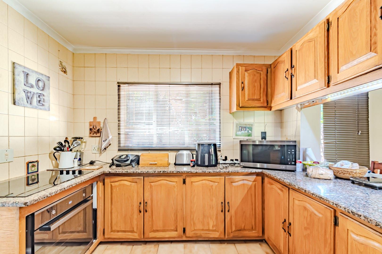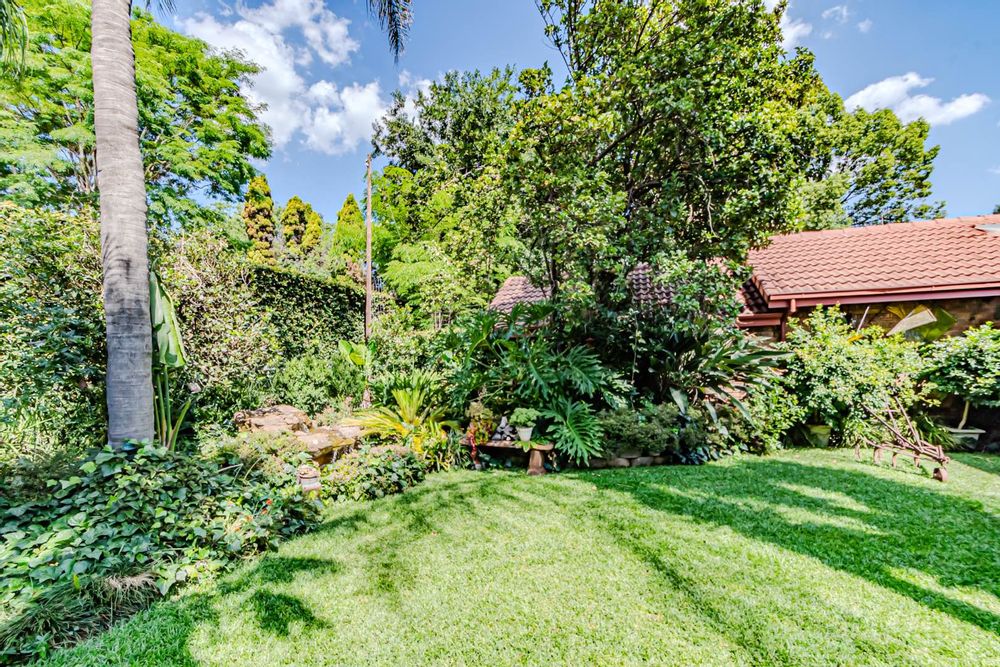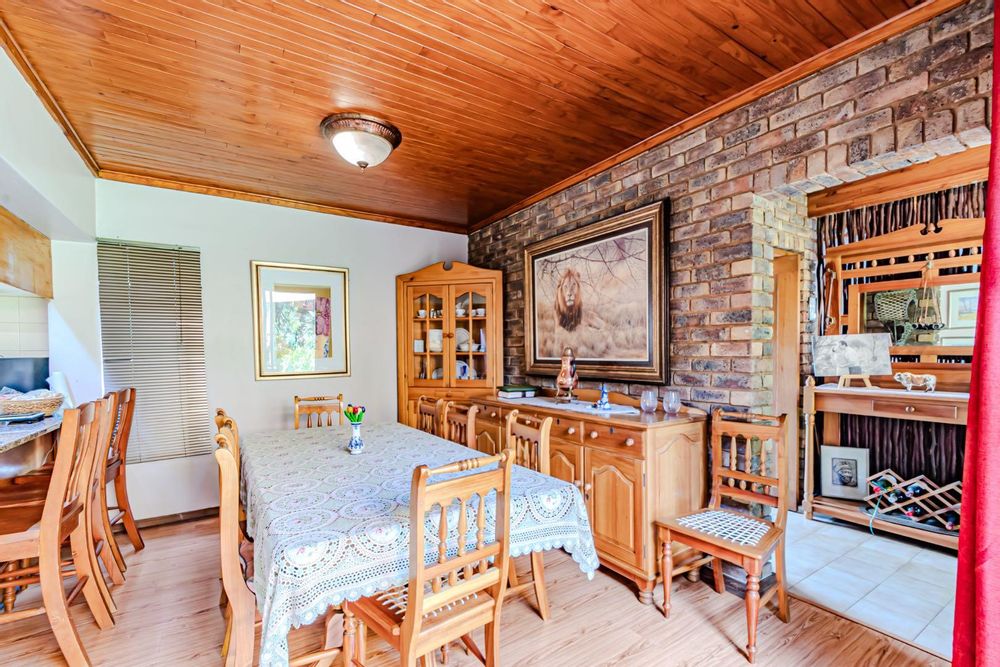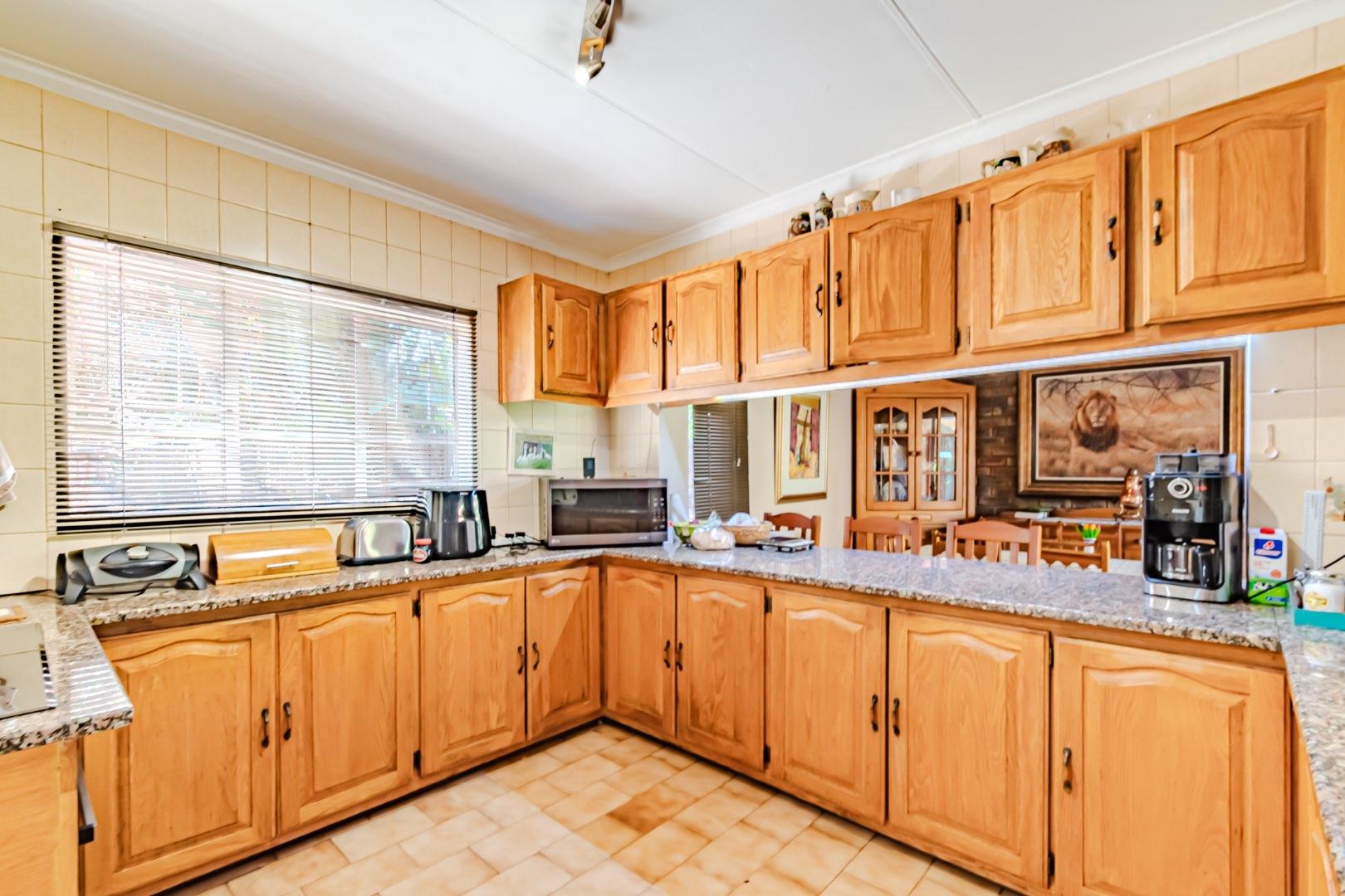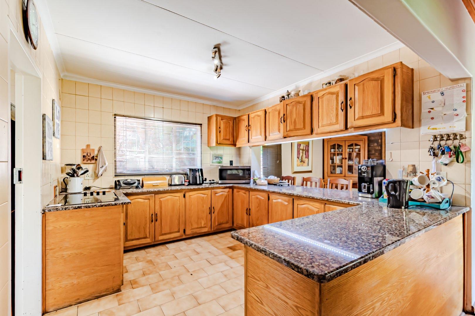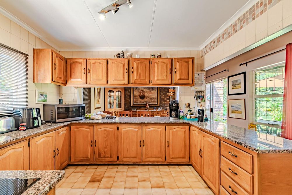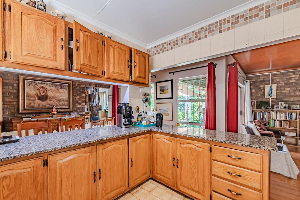 The kitchen has a functional design with granite worktops and solid wood cupboards, complemented by a separate scullery that enhances storage and preparation capabilities. Parking is generously catered for with double automated garages and an additional carport suitable for a trailer or small vehicle. The property's outdoor space includes a well-established, consistently maintained garden, creating an attractive external environment.