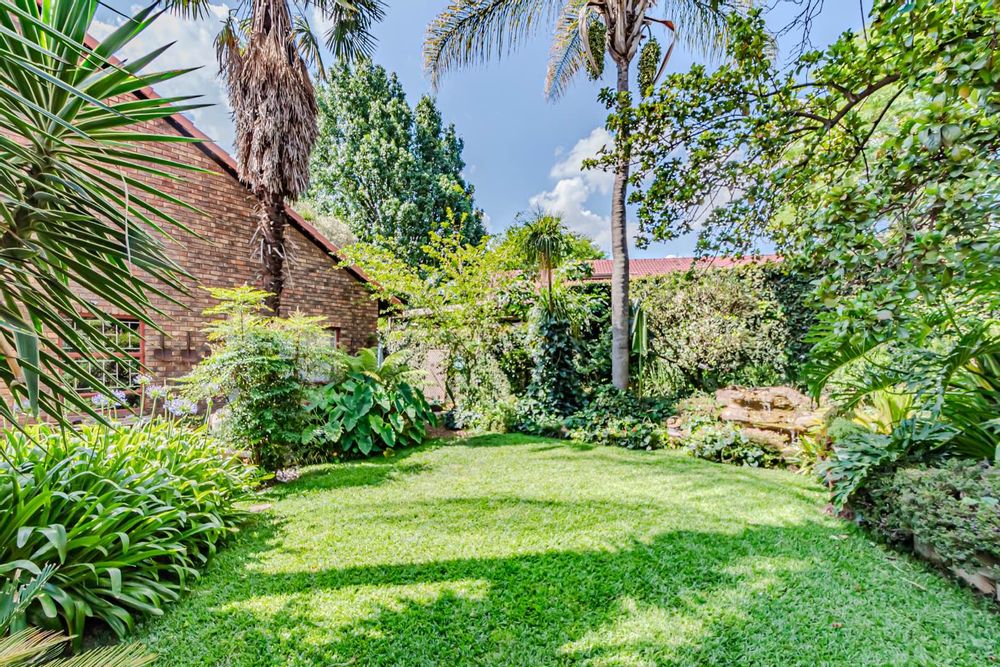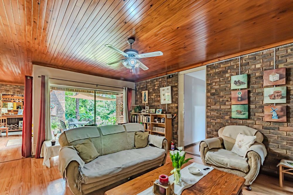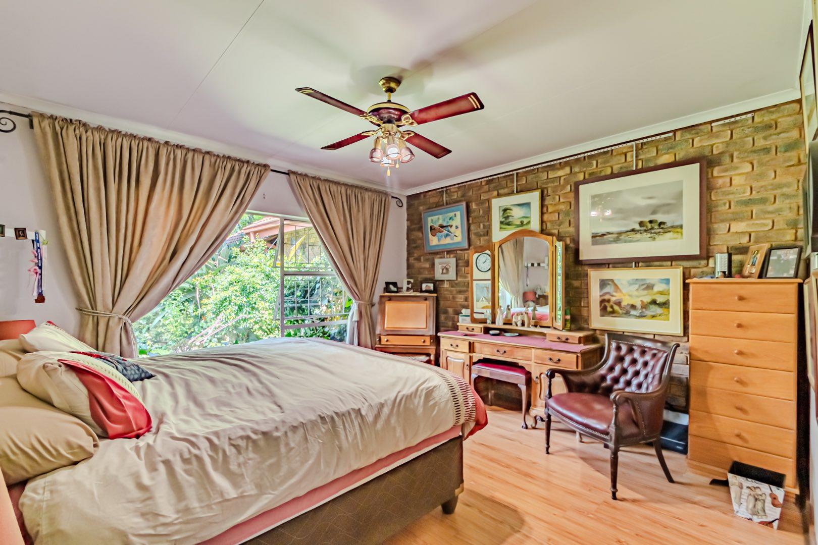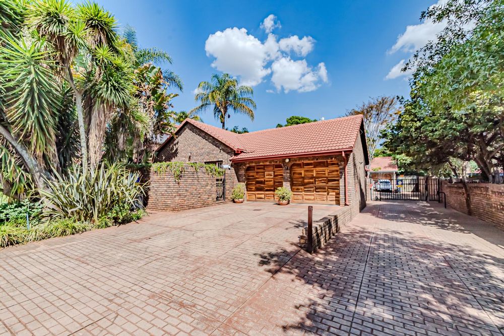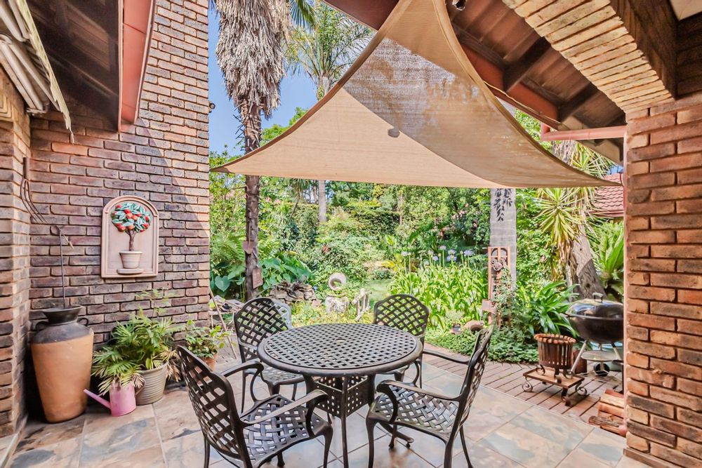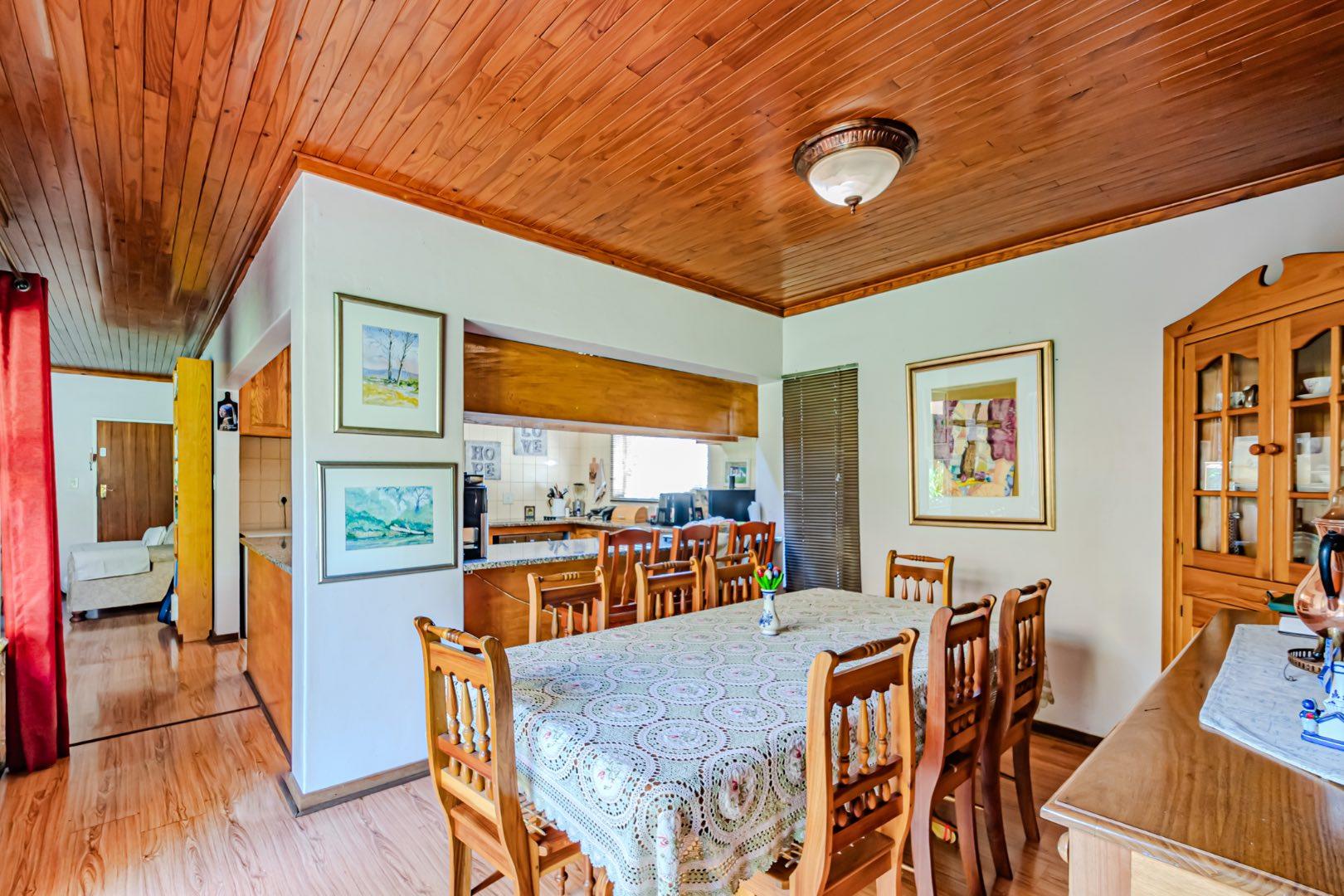 The kitchen has a functional design with granite worktops and solid wood cupboards, complemented by a separate scullery that enhances storage and preparation capabilities. Parking is generously catered for with double automated garages and an additional carport suitable for a trailer or small vehicle. The property's outdoor space includes a well-established, consistently maintained garden, creating an attractive external environment.