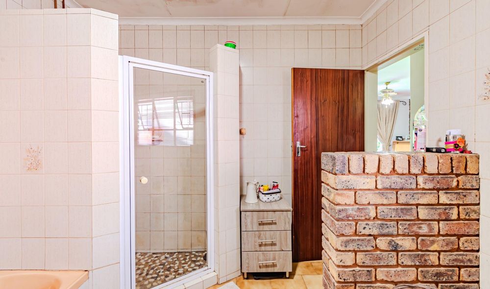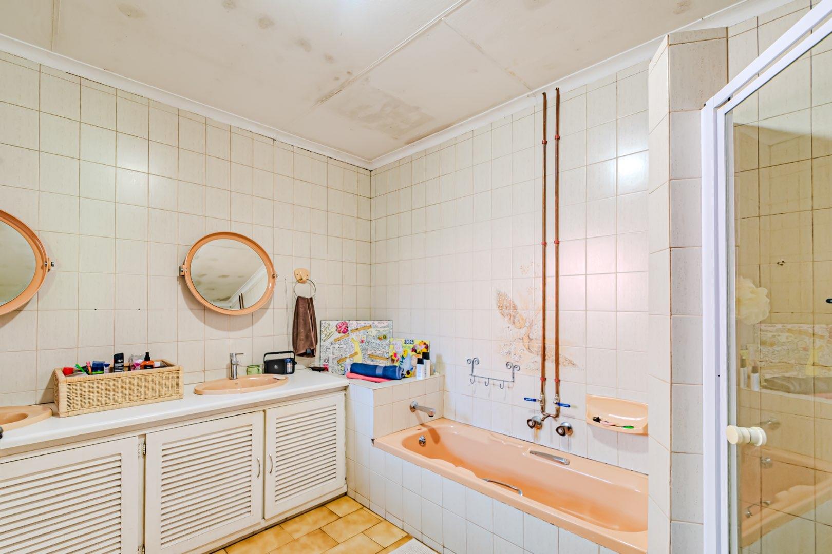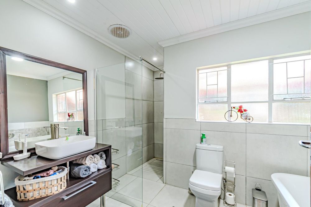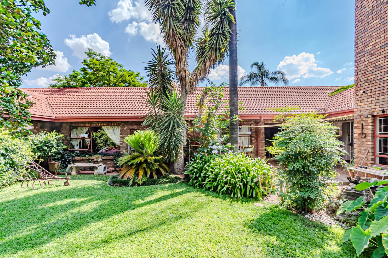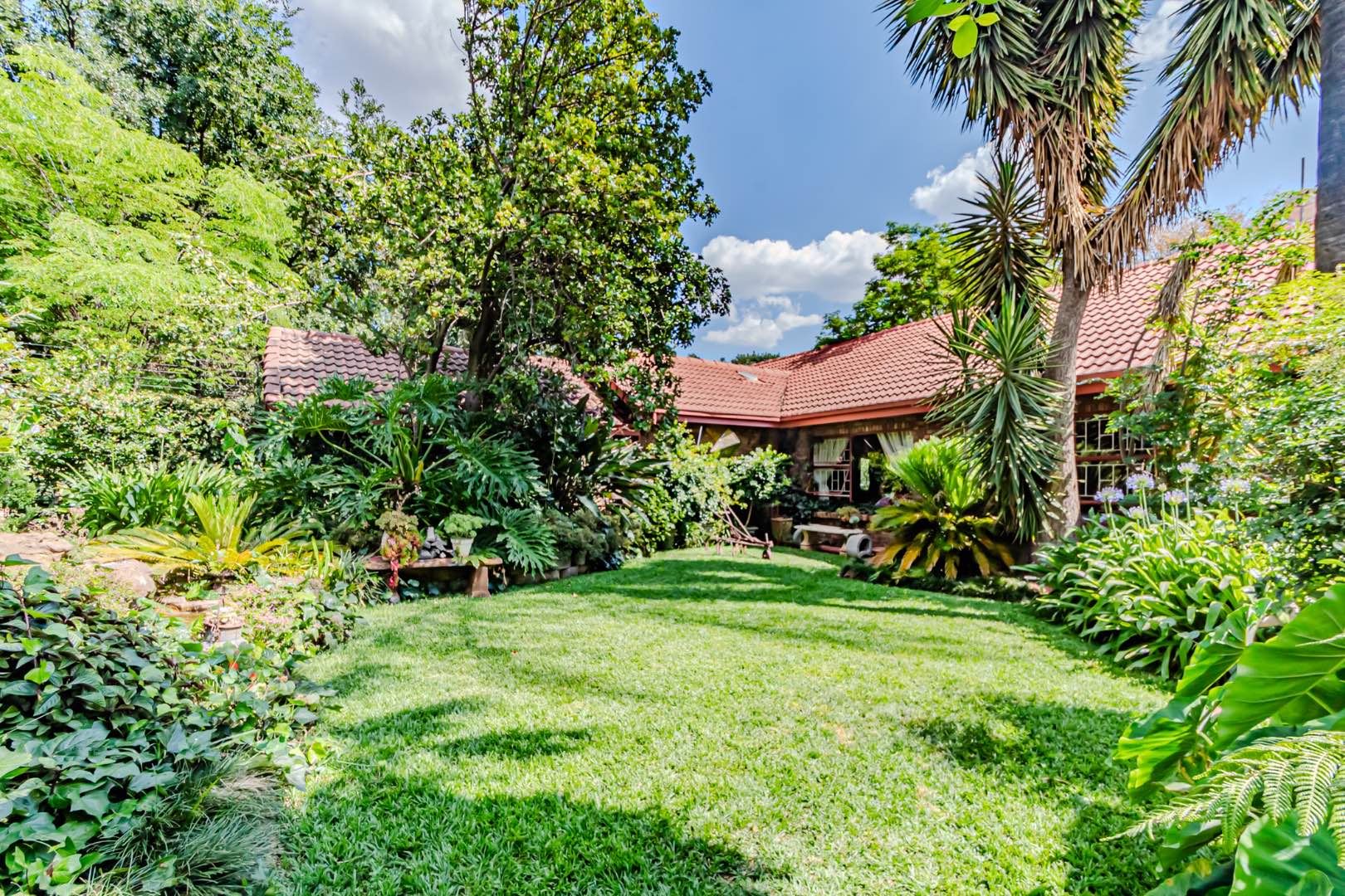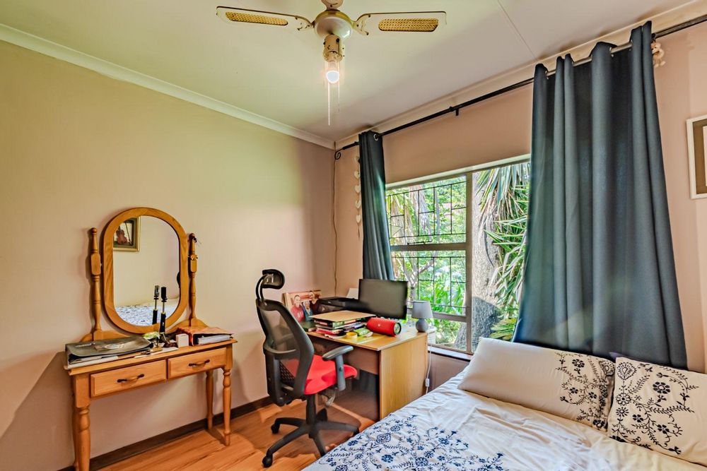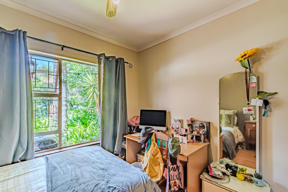 The kitchen has a functional design with granite worktops and solid wood cupboards, complemented by a separate scullery that enhances storage and preparation capabilities. Parking is generously catered for with double automated garages and an additional carport suitable for a trailer or small vehicle. The property's outdoor space includes a well-established, consistently maintained garden, creating an attractive external environment.