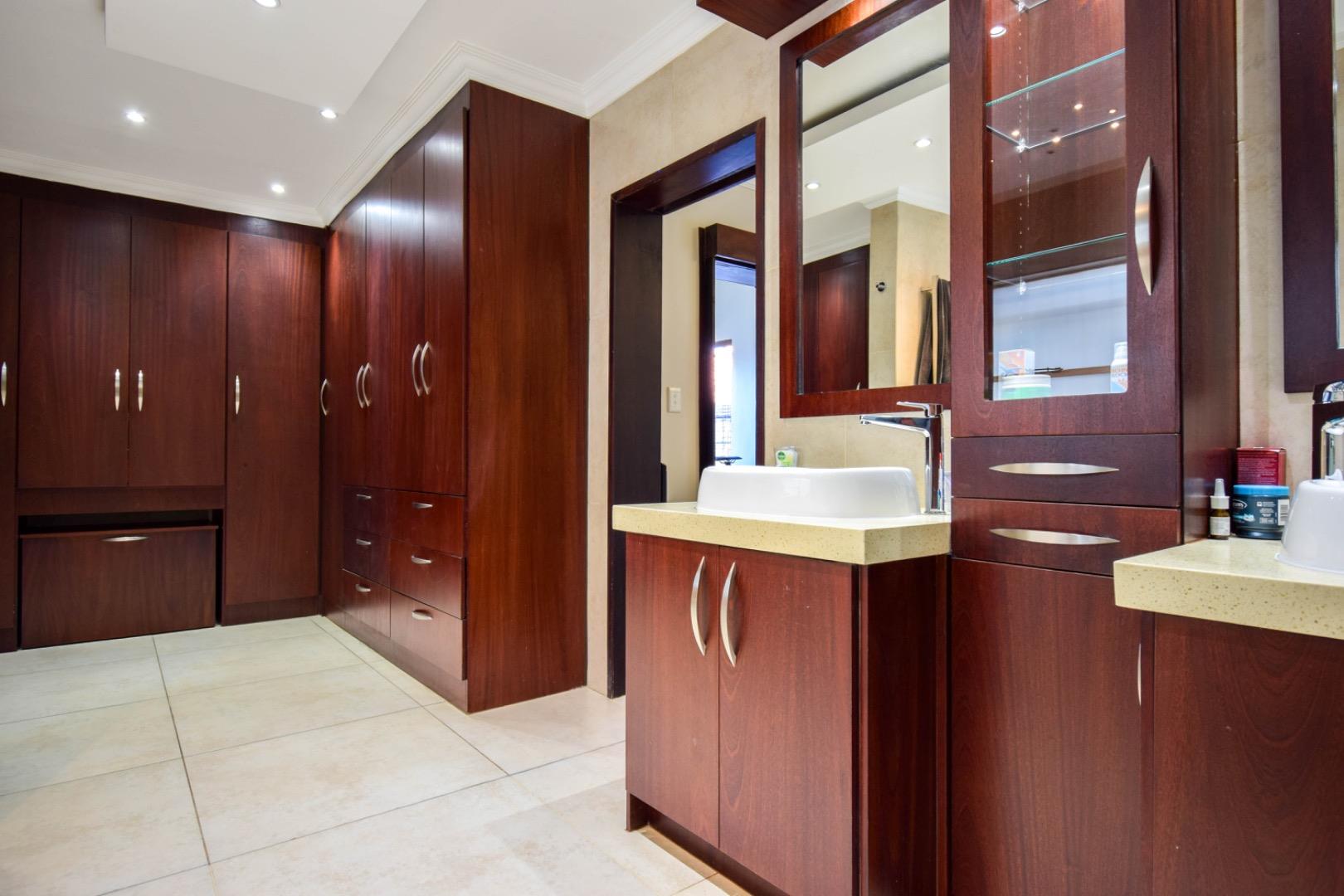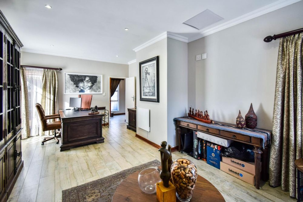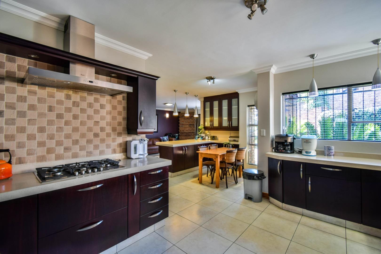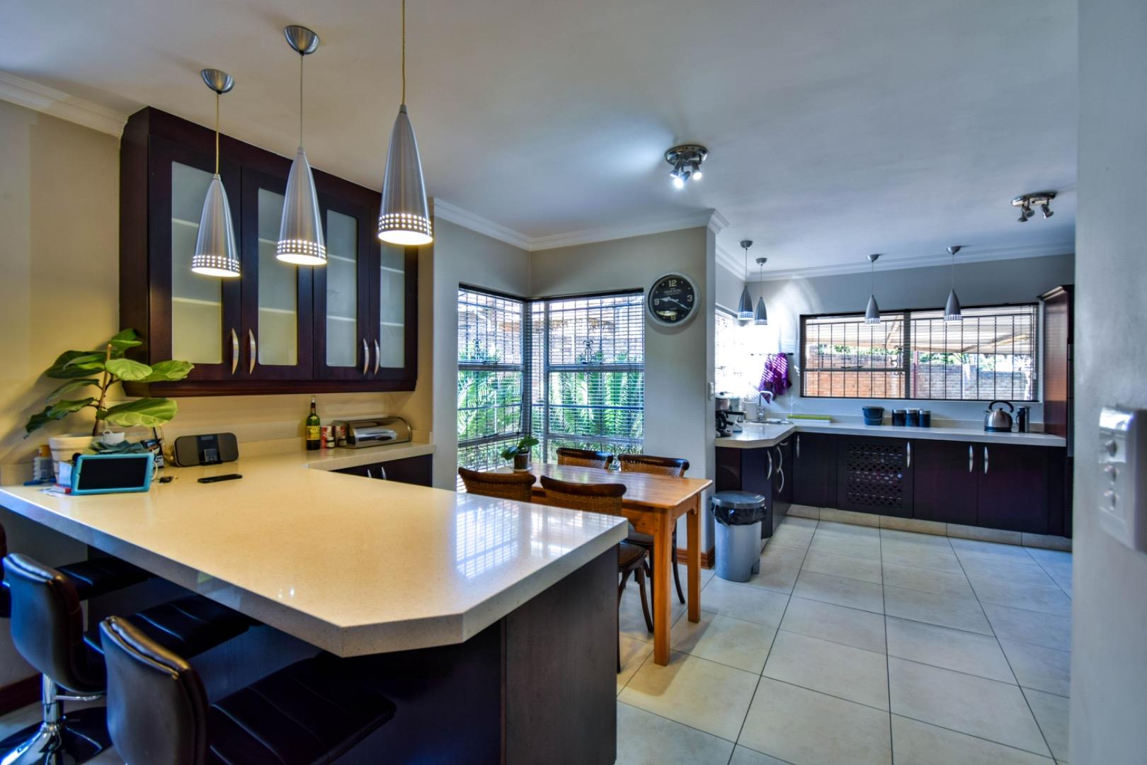 The contemporary kitchen showcases premium Caesarstone countertops and ample storage solutions. A separate scullery and pantry keep preparation areas organised, while the dedicated home office ensures remote work never interrupts family time.