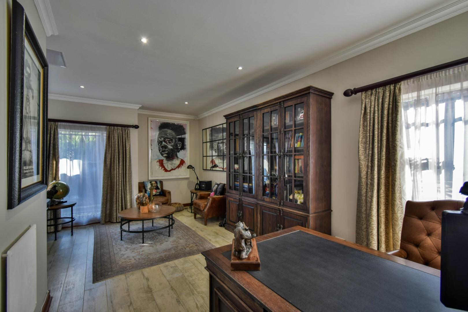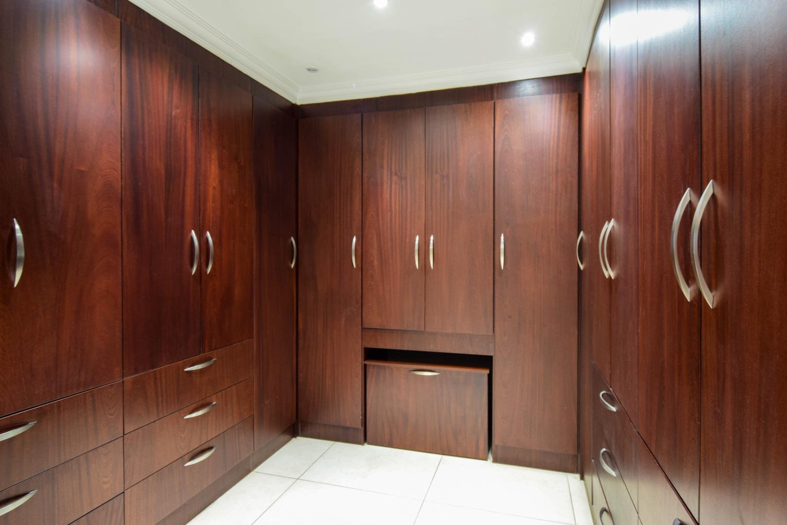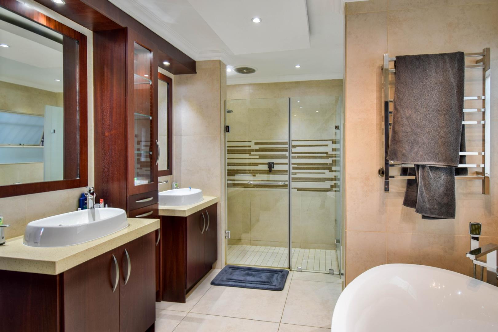 The contemporary kitchen showcases premium Caesarstone countertops and ample storage solutions. A separate scullery and pantry keep preparation areas organised, while the dedicated home office ensures remote work never interrupts family time.