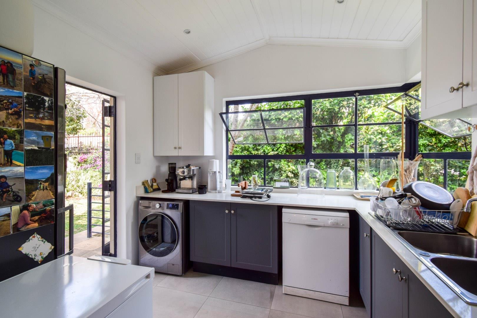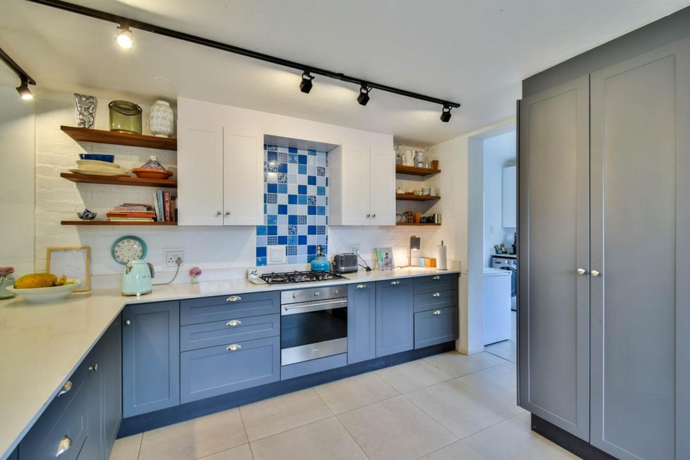 -A modern kitchen with Caesarstone countertops, ample cupboards, and a separate scullery