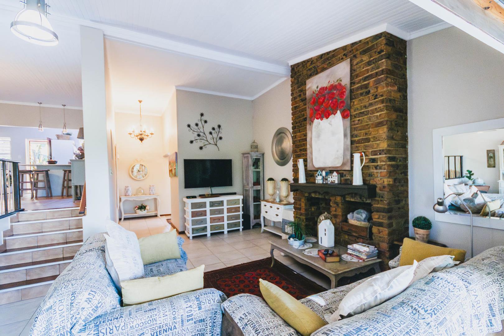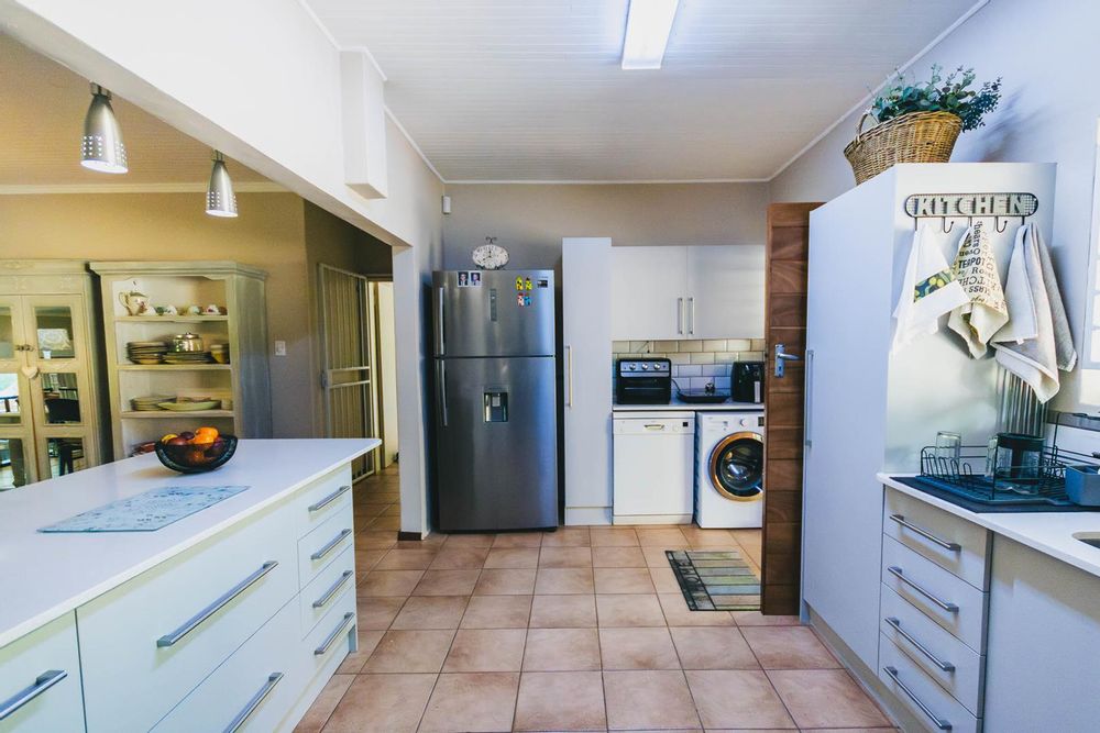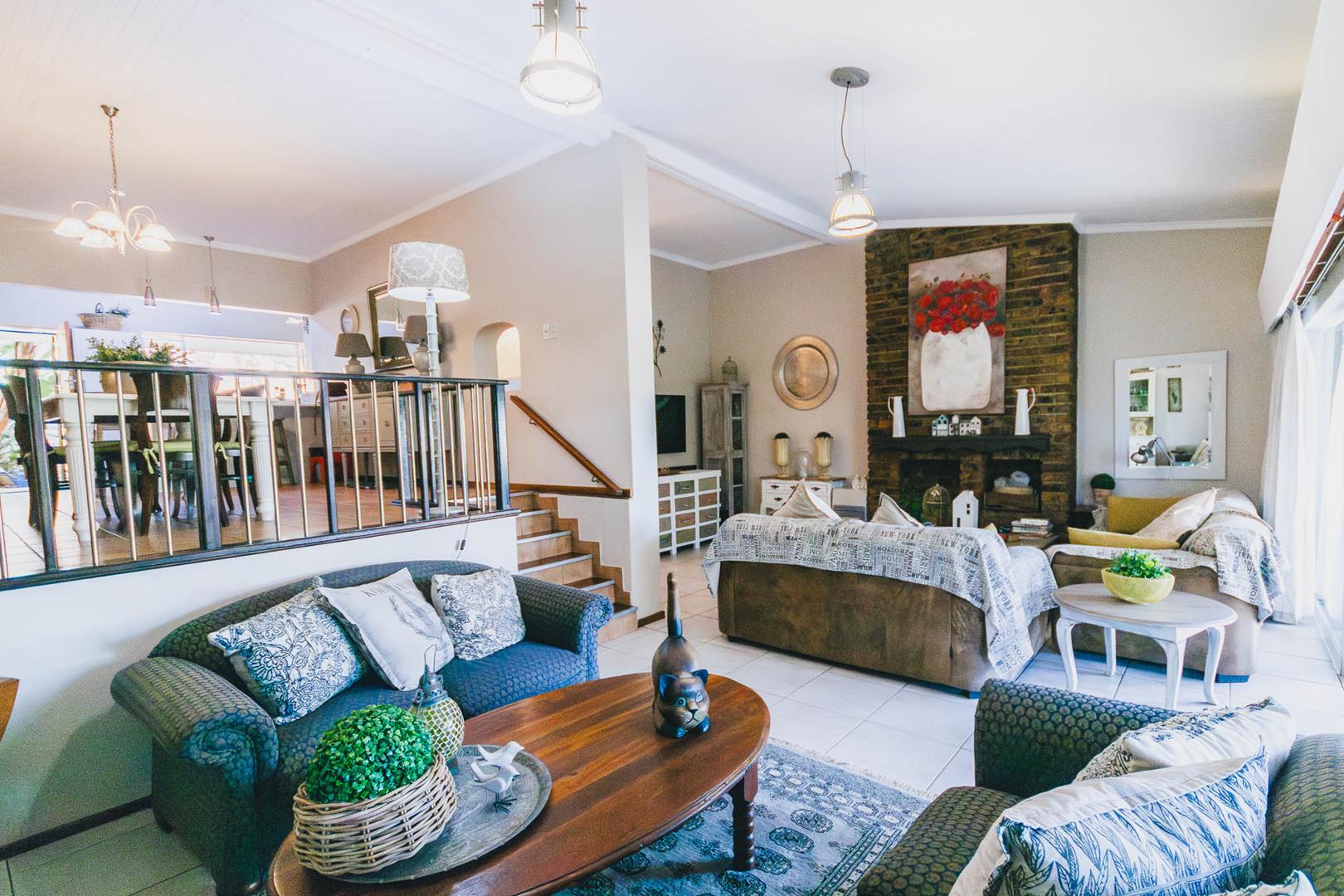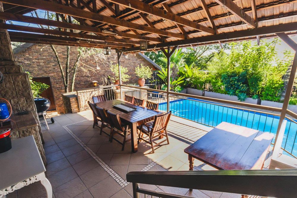 The main residence is a spacious, thoughtfully designed 3-bedroom home, complemented by two additional flats or a flat and office space, offering versatile living options. The primary dwelling includes 3 bedrooms, 2 bathrooms, and a cozy study nook. Its open-plan living areas are set on varying levels, seamlessly connecting to a captivating resort-style covered entertainment area. This delightful space overlooks a brand-new sparkling pool, surrounded by lush greenery, perfect for relaxation and social gatherings. This property has a comprehensive security system consisting of alarm, beams, cameras and electric fence, creating a secure environment to feel safe in.