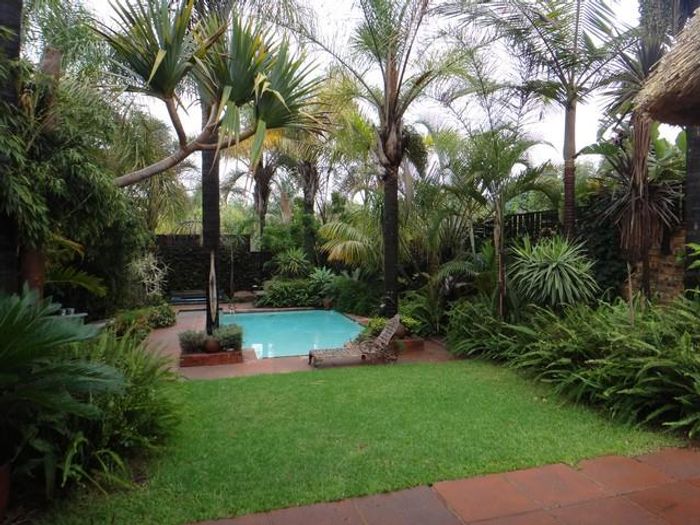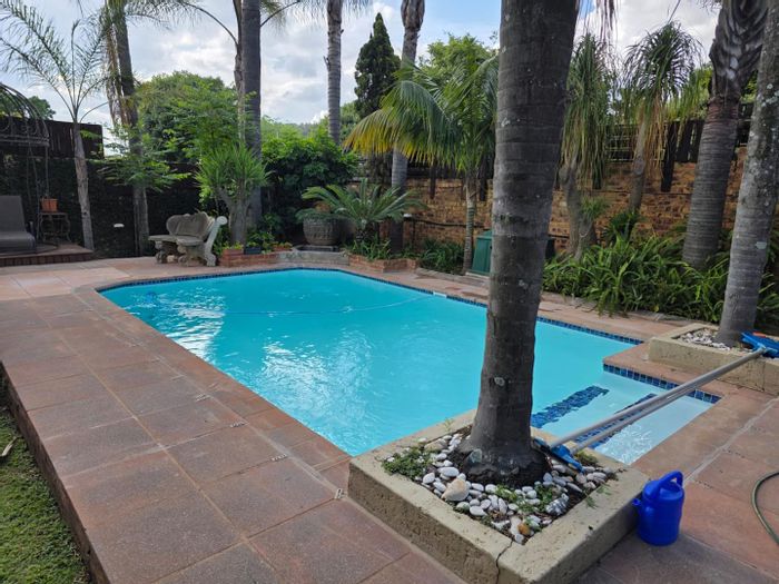 Relaxed family living in quiet Faerie Glen — peaceful leafy street perfect for kids, with a sparkling pool and lapa with built-in braai, four bedrooms, 2.5 baths, double garage.